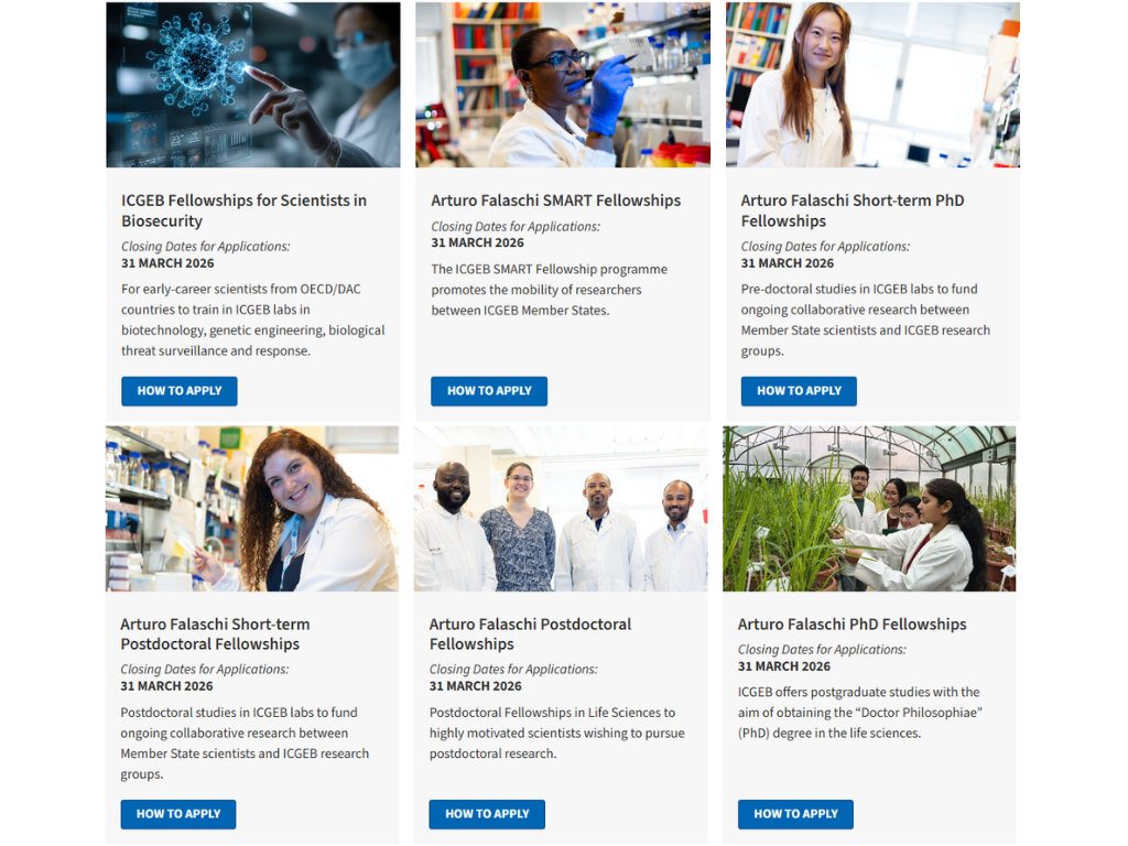 ๐๐๐๐๐ telah membuka permohonan bagi pelbagai program fellowship antarabangsa kepada penyelidik dan saintis dari negara anggota, termasuk Malaysia. ICGEB merupakan sebuah pertubuhan antarabangsa antara kerajaan (intergovernmental) yang membantu negara-negara membangun melaksanakan aktiviti penyelidikan, latihan dan pemindahan teknologi dalam bidang kejuruteraan genetik dan bioteknologi yang berpangkalan di Trieste, Itali.